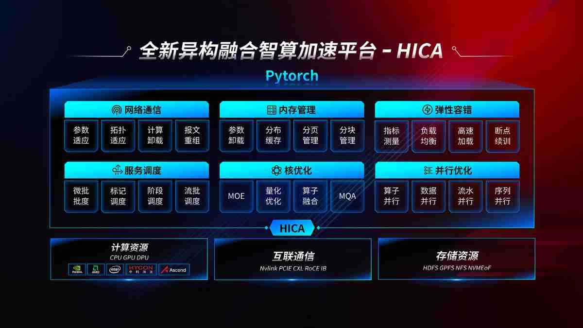 通过自研的服务层、、中间适配层、、以及调度编排算法,,,,采用数据并行、、模型并行等多种并行方式,,,把并行计算任务进行有效的分解,,,,使其分别由相应的软件栈和算力资源来承接。。。当GPU资源变化,,,,HICA可以实时动态调度计算子任务并调整模型拓扑和架构,,,以充分聚合各种算力资源。。。。